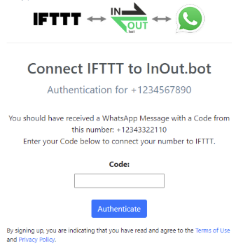 You'll then receive a message from the InOut.bot's number via WhatsApp with a one time code. Enter this code on in the code field then press authenticate