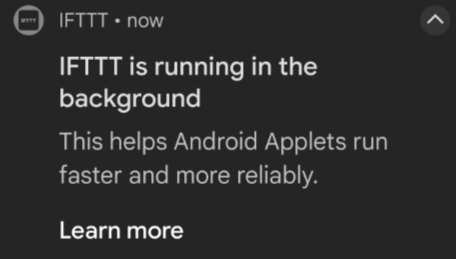 You might notice a small persistent notification on your Android device that says the IFTTT app is running in the background. This is part of how the IFTTT app on Android ensures that Applets work correctly.