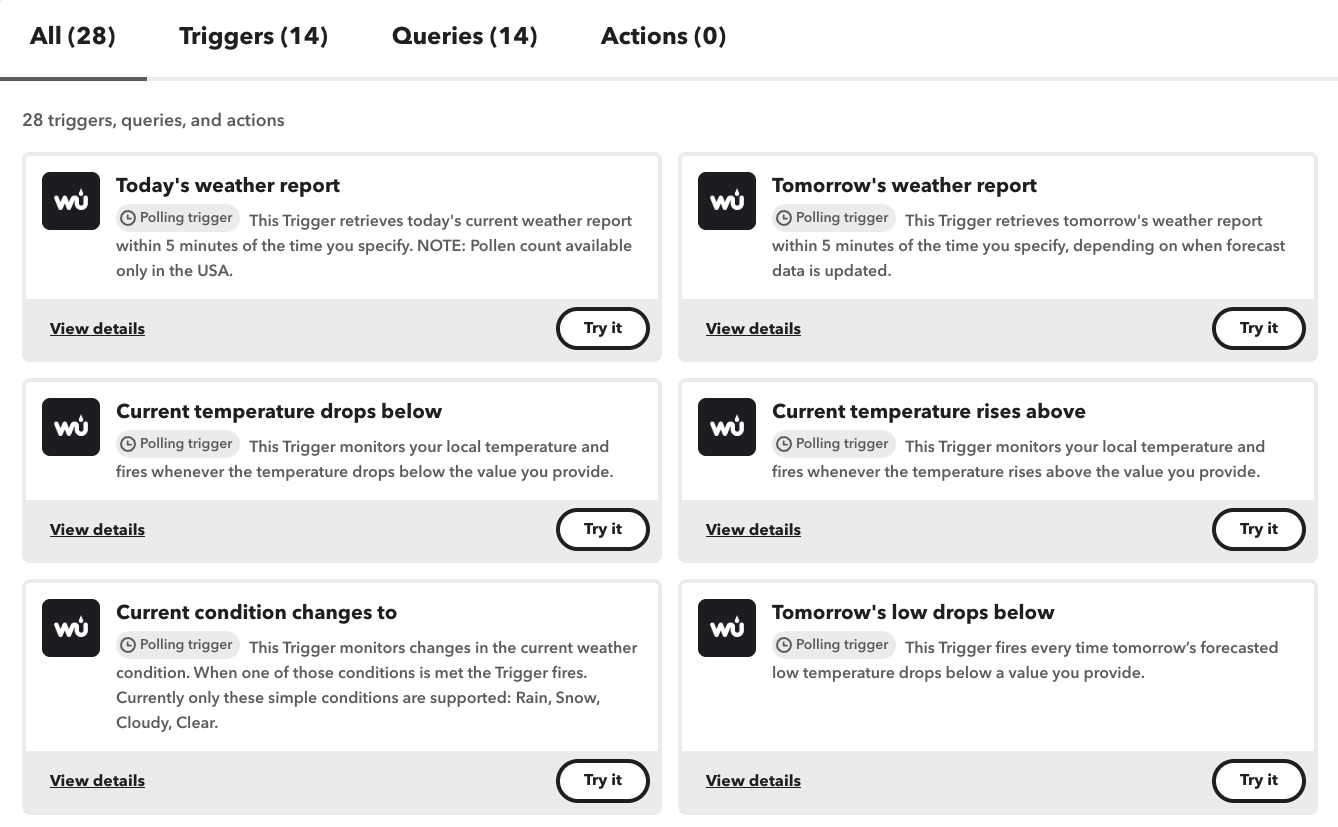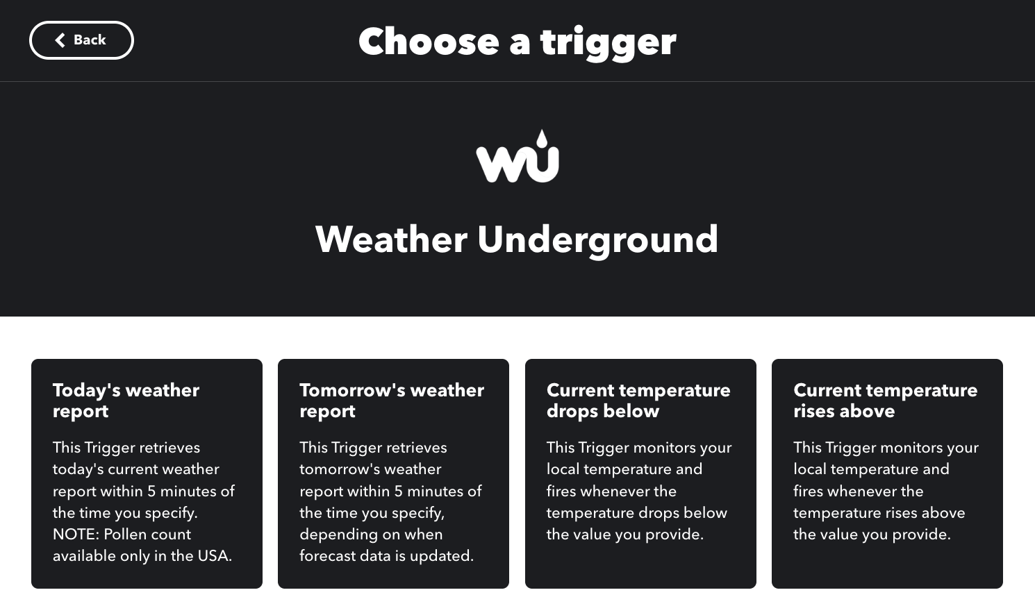 Triggers and Actions without a badge are available on all tiers, including Free.In the example below from the Weather Underground service, none of the Triggers or Actions include a Pro or Pro+ badge, so they can be used on any plan: