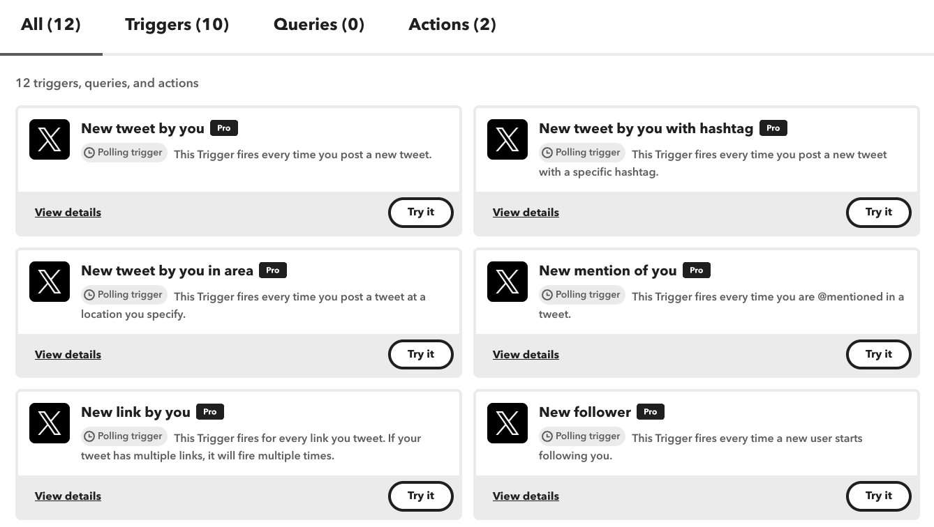 After selecting a service in the Applet composer, you’ll see the list of available Triggers, Queries, and Actions. Each item will display a badge if it requires a Pro or Pro+ subscription.