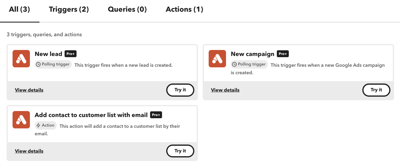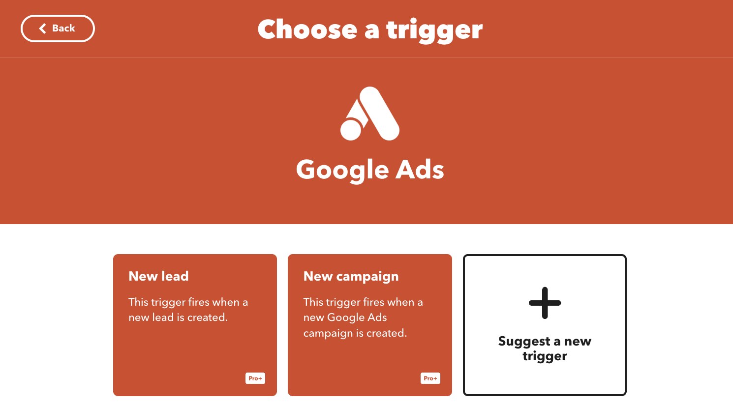 Triggers and Actions with a Pro+ badge require an IFTTT Pro+ subscription.In the example below from the Google Ads service, the Pro+ badge indicates they are only available on Pro+:
