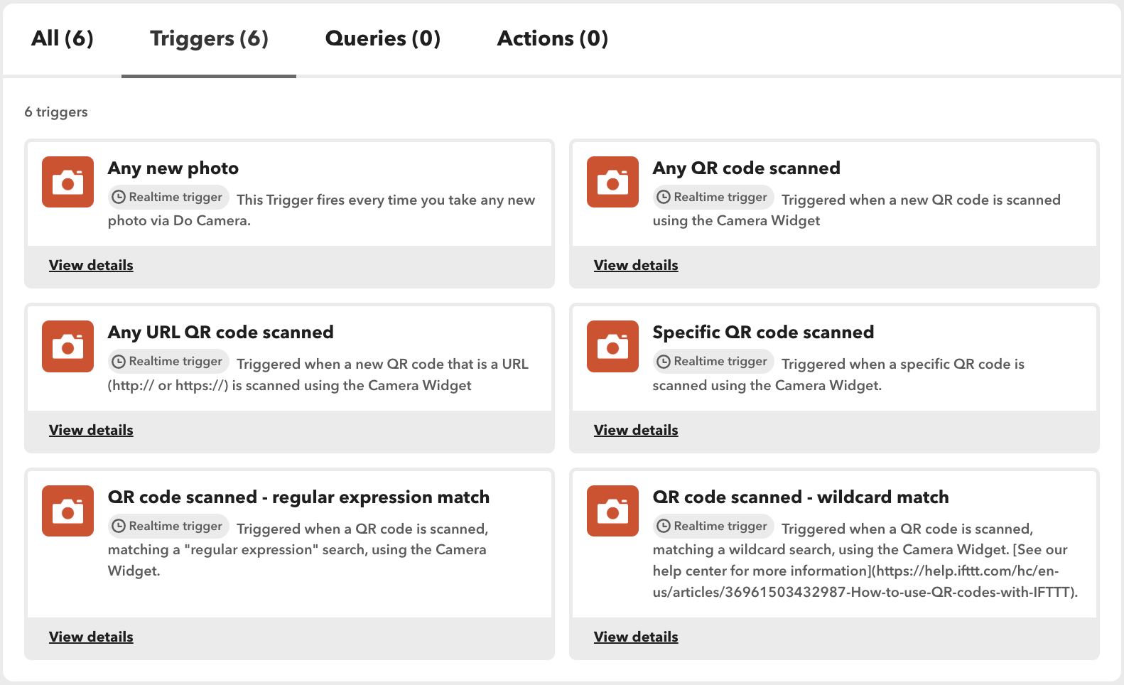 When you're on a service page, scroll down to see the available Triggers, Queries, and Actions for that service. Triggers will be labeled as either Realtime or Polling, so you can easily identify how they work.
